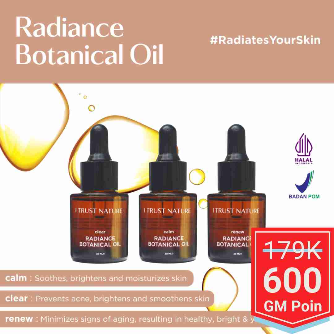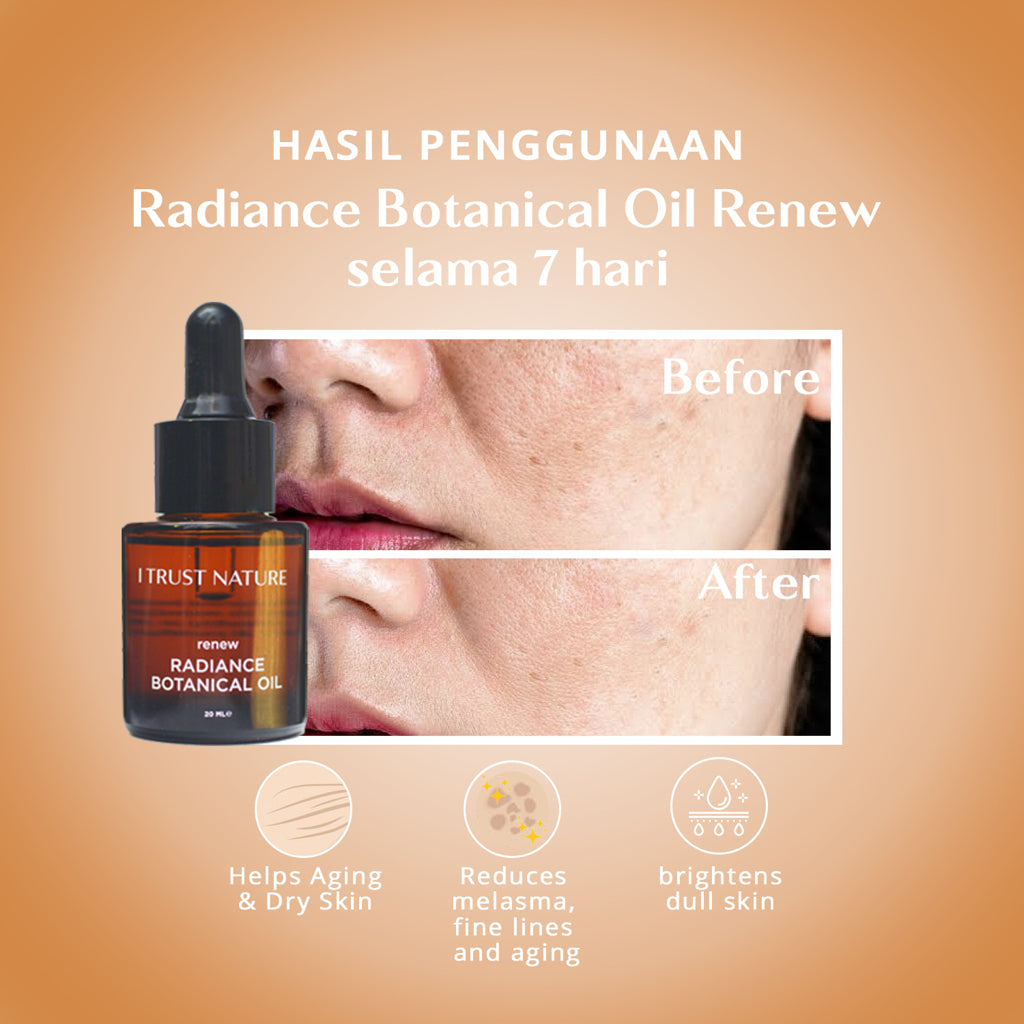 Renew-Radiance Botanical Oil terbuat dari 100% minyak botanical pilihan yang diformulasikan untuk membantu melembabkan dan menutrisi kulit kering dan kusam, serta membantu merawat kulit yang mengalami tanda-tanda penuaan seperti flek hitam, garis halus dan kerutan. Pemakaian secara rutin memberikan hasil kulit yang lembab, cerah merata, halus dan tampak lebih muda