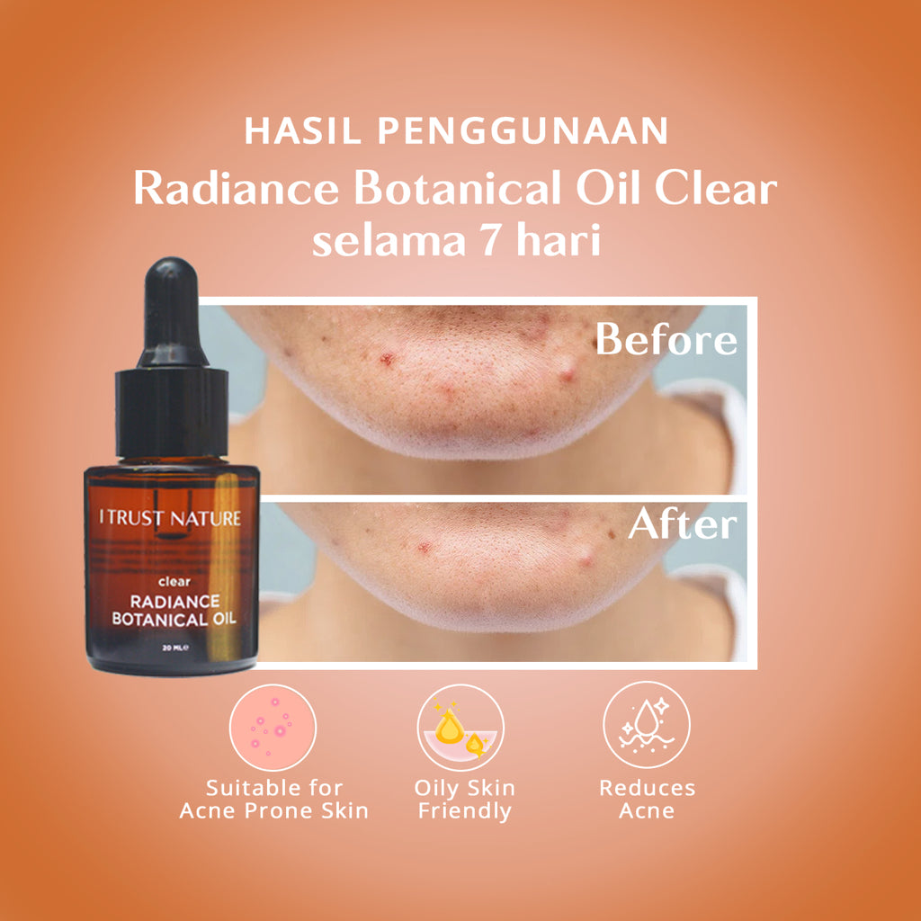 Clear-Radiance Botanical Oil terbuat dari 100% minyak botanical pilihan yang diformulasikan untuk membantu merawat kulit yang rentan berjerawat dan menutrisi kulit yang kusam dan mudah berminyak. Pemakaian secara rutin dapat membantu mencegah timbulnya jerawat dan memberikan hasil kulit yang lebih cerah, halus dan sehat bercahaya