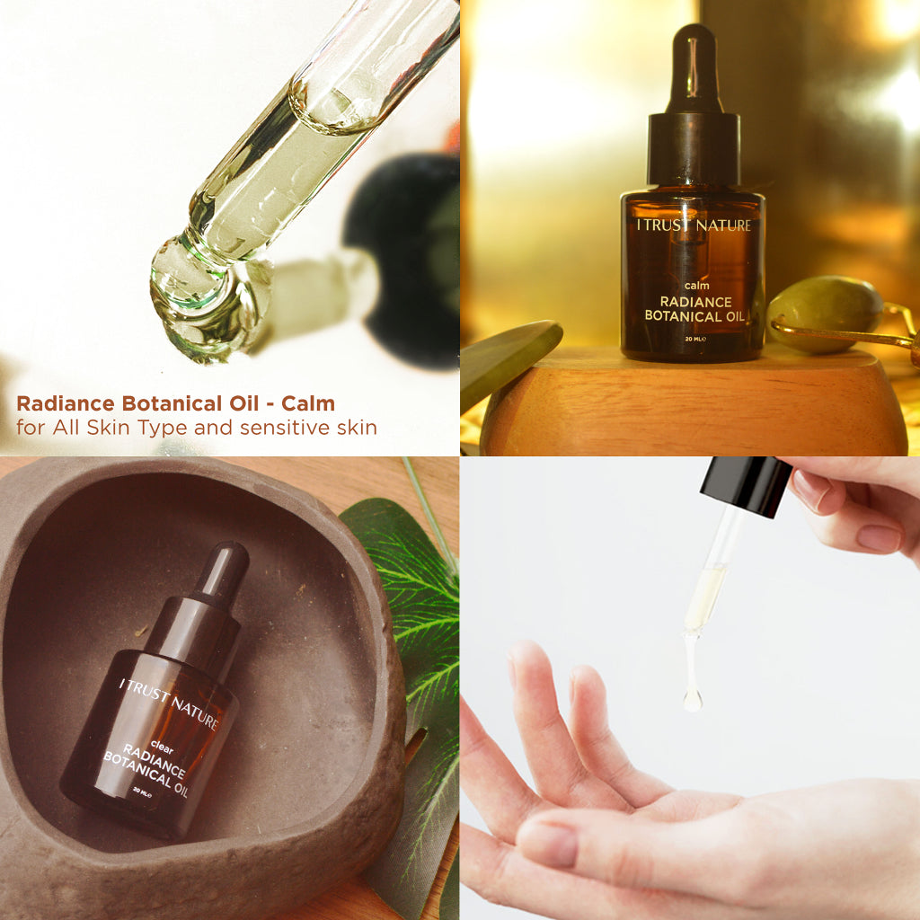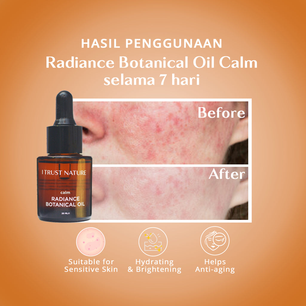 Calm-Radiance Botanical Oil terbuat dari 100% minyak botanical pilihan dengan tekstur yang ringan nyaman digunakan sehari-hari tanpa membuat kulit terasa berminyak. Pemakaian secara rutin memberikan hasil kulit yang lembab, cerah merata dan sehat bercahaya serta memperlambat penuaan dini