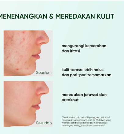 Mugwort : Memiliki sifat anti-inflamasi yang baik untuk membersihkan & menenangkan kulit. Skin barrier kulit akan selalu terjaga dan mengecilkan pori-pori